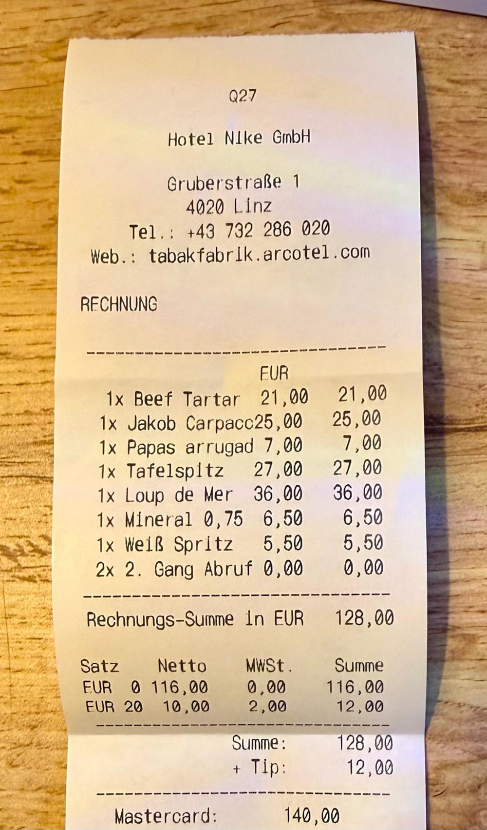 Ebenfalls relativ fair die Getränkepreise (u.a. Spritzer um 5,50 Euro, die 075l Flasche Mineral um 6,50.-). Wir bezahlten in Summe 128 Euro für Vor- und Hauptspeise plus Getränken (plus moderate Parkgebühren in der Tiefgarage (3 Euro/Stunde bis 19:30 Uhr, danach moderate 2,40/Stunde, Nachtschwärmertarif von 18 bis 02 Uhr maximal 6,50). Was wir uns gewünscht hätten: Stoffservietten in diesem doch gehobenen Umfeld…