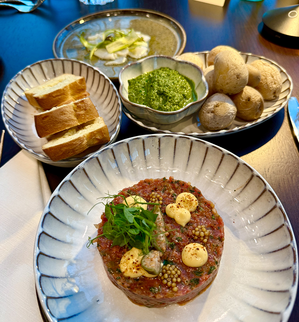 Vorspeisen: Papas Arrugadas (7.- / leider eiskalt), Beef Tartar (21.- / hervorragend) und das sehr überschaubare Jakobsmuschel Carpaccio mit grünem Spargel (28.- / Hintergrund).