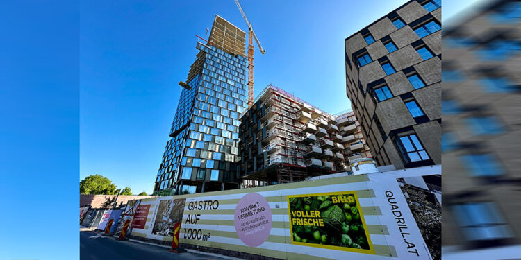 Kurz vor der Fertigstellung steht das Quadrill-Ensemble in der Tabakfabrik mit dem 109m-Hochhaus als markante Landmark. Jetzt wurden erste Details bekannt, welche Unternehmen in den Sockelbereich einziehen werden.
