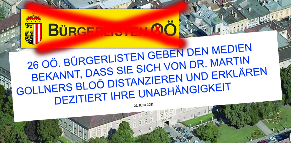 Auf der einen Seite: Dr. Martin Gollner, Gründer der „Bürgerlisten OÖ“. Aussagen, dass unzählige Bürgerlisten bei BLOÖ mit dabei seien, schwirrten damals beim Start durch den Raum. Im Juni distanzierten sich aber gleich 26 OÖ Bürgerlisten von Gollners Partei, laut einer Insiderin dürften landesweit nur mehr „drei oder vier Bürgerlisten mit höchstens 20 Leuten“ bei der BLOÖ mit dabei sein. Auf der BLOÖ Homepage scheinen aber nach wie vor viele Bürgerlisten auf, die nachweislich nicht mehr mit an Bord sind – etwa die Bürgerliste Rutzenham, obwohl man dort mit Gollner & Co seit ein paar Wochen nichts mehr zu tun haben will.