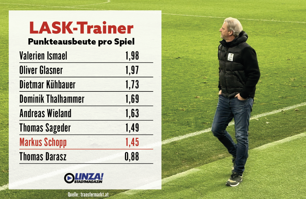 Beim Punkteschnitt besteht durchaus noch Luft nach oben, Schopp kommt nach 29 Pflichtspielen auf 1,45 Punkte pro Spiel. Zählt man nur die Bundesligaspiele, sind es 1,33 Punkte pro Spiel. Nur sein direkter Vorgänger Thomas Darazs kam in seinen acht Pflichtspielen auf einen schlechteren Schnitt (0,88).
