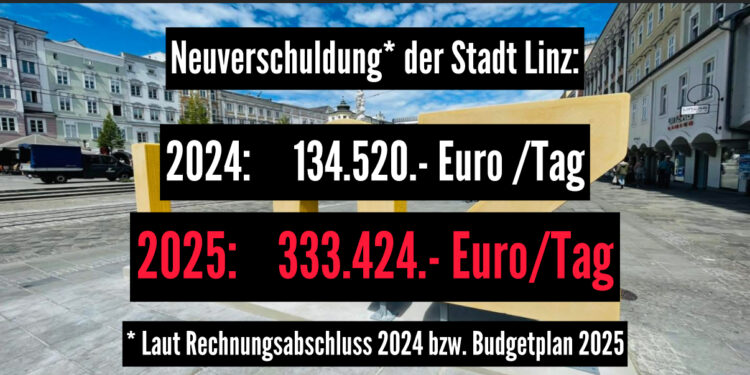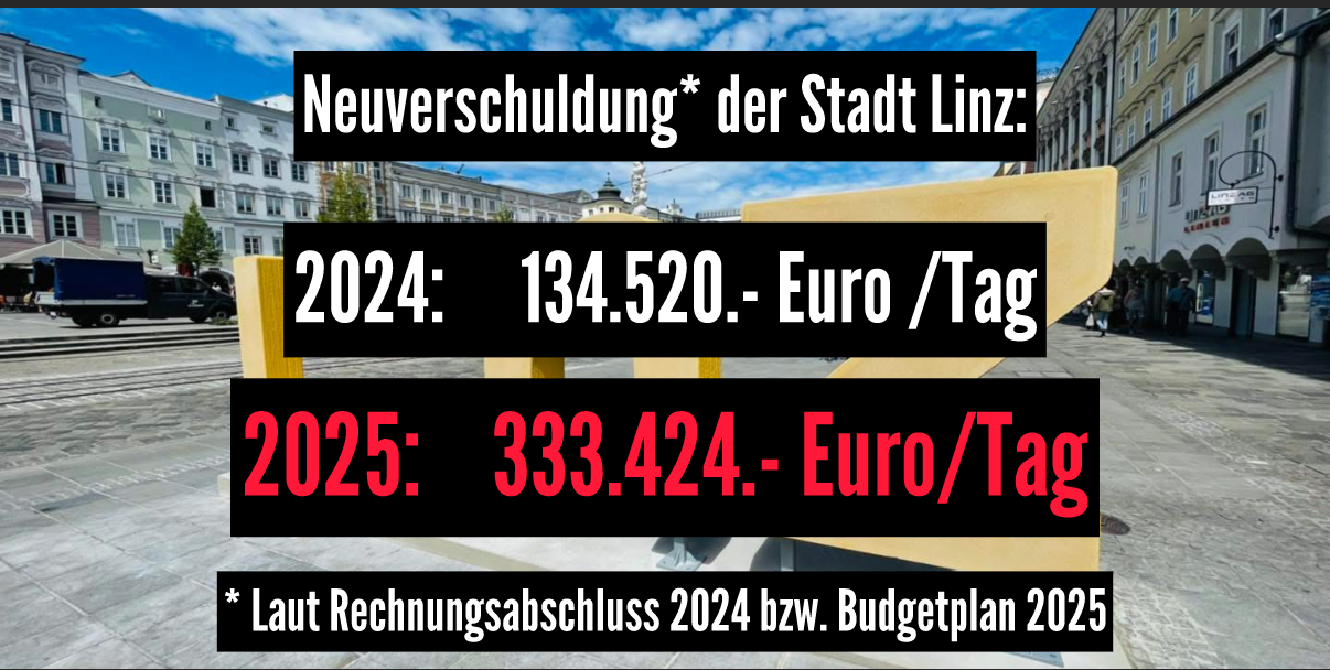 Die Neuverschuldung der Stadt Linz nimmt dramatische Ausmaße an: Kamen 2024 „nur“ 49,1 Mio Euro dazu, sind es heuer wohl über 121 Millionen zusätzliche Schulden – oder 333.424 Euro pro Tag.