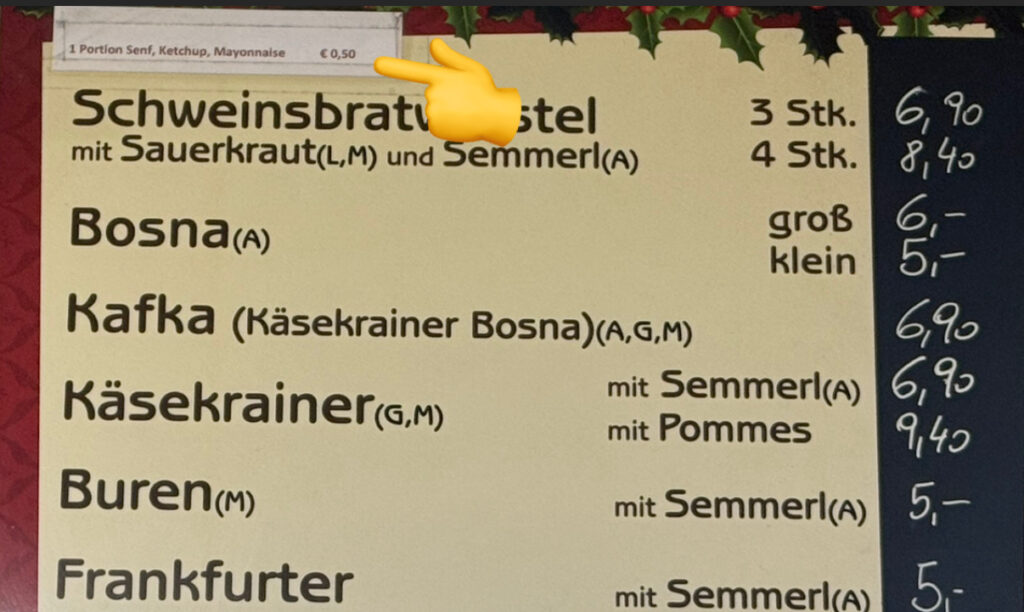 „8,40 Euro für 4 Bratwürstl mit Sauerkraut und Semmerl im Volksgarten-Christkindlmarkt – und dann sind auch noch 50 Cent extra für einen Spritzer Senf abzudrücken. Ich halte das für wirklich frech“, schreibt uns Userin Christine P. aus Urfahr.