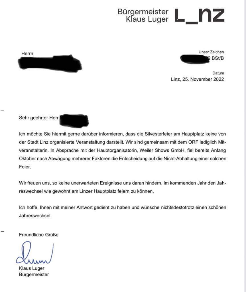 Luger beteuerte kurz nach Halloween in den Medien mehrmals, die Stadt hätte mit den Silvesterfeiern nichts zu tun, weil man ja gar nicht der Veranstalter wäre, sondern die private WEILER SHOWS GMBH. Jetzt – fast drei Wochen später – bekam der erwähnte Gastronom ein Antwortschreiben vom Bürgermeister. Darin heißt es nun, die Stadt wäre sehr wohl „Mitveranstalter“ der Hauptplatz-Silvesterfeier. Rütteln wolle er an der für viele mutlosen Absage nicht mehr. Luger stellte jedoch in Aussicht, „im kommenden Jahr den Jahreswechsel wie gewohnt am Linzer Hauptplatz feiern zu können.“ Seltsam mutet an, dass er explizit „unerwartete Ereignisse“ als Grund für eine neuerliche mögliche Absage erwähnt – eine Anspielung auf das heurige, aufgrund der Randale beschlossenen Event-Storno?