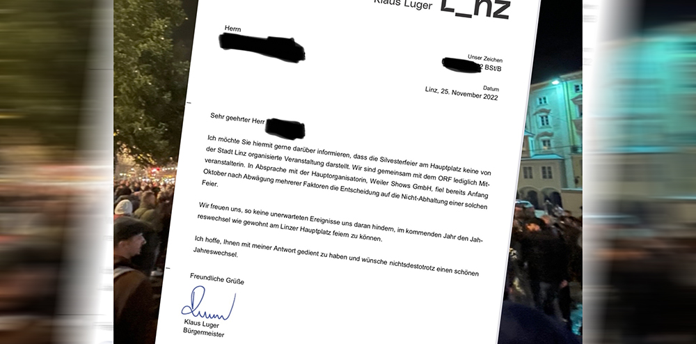Nachdem die Stadt Linz just drei Tage nach den Halloween-Randalen auf der Landstraße die (angeblich schon Wochen zuvor fixierte) mutlose Absage der Silvesterfeier am Hauptplatz verkündete, wandte sich Anfang November ein Altstadtgastronom mit einem Schreiben an Bürgermeister Luger: „Ich bitte Sie, nochmal darüber (die Absage, Anm.) nachzudenken, die Linzerinnen und Linzer hätten sich nach diesen schwierigen Jahren wirklich eine ordentliche Silvesterfeier verdient“, so der damalige Wortlaut.