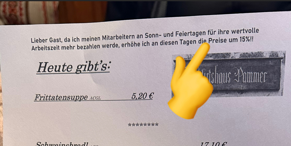 Auch bei uns gibt es bereits einige Betriebe, die diese Preiserhöhung am Sonntag bereits eingeführt haben: „Lieber Gast, da ich meinen Mitarbeitern an Sonn- und Feiertagen für ihre wertvolle Arbeitszeit mehr bezahlen werde, erhöhe ich an diesen Tagen die Preise um 15%!“, schreibt der Wirt vom überregional bekannten Traditionsgasthaus Prammer in Hirschbach auf seiner Speisekarte. „Kein Problem, aber Trinkgeld zahlen wir dann aber keines mehr extra“, verrät ein Pärchen bei seinem Besuch beim Gasthaus Prammer.