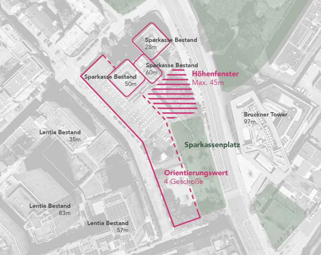 Der aktuell davor befindliche Parkplatz wird voraussichtlich viergeschoßig (Orientierungswert) verbaut. Gegenüber des Bruckner Towers soll ein „Sparkassenplatz“ entstehen, nördlich davon ist ein Neubau mit einer Höhe bis 45 Metern angedacht.