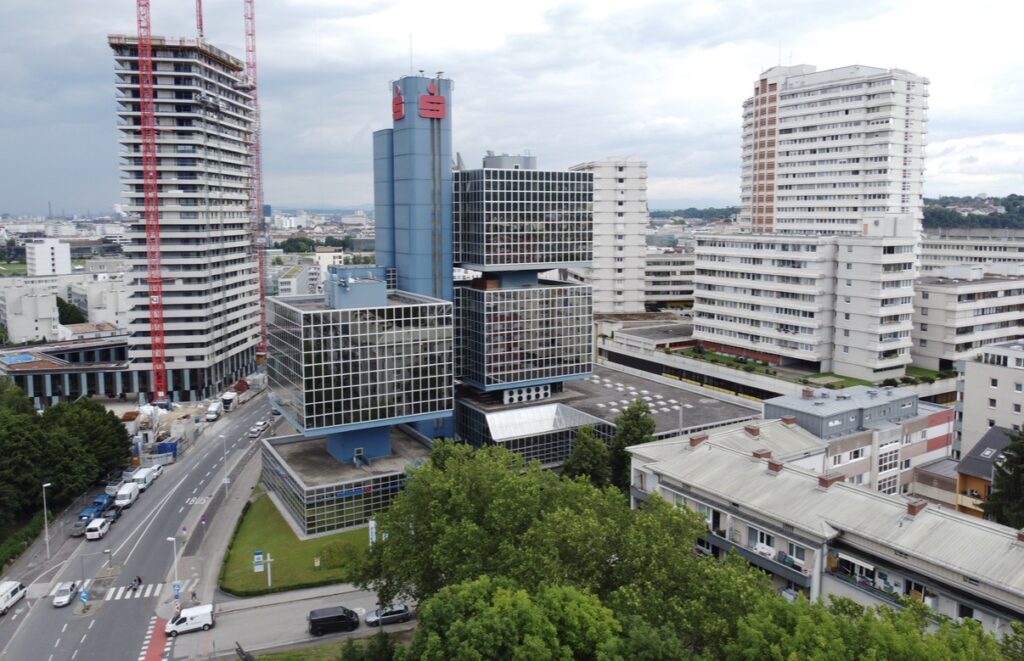 Diskussionen rund um das markante, 60 Meter hohe Sparkasse OÖ Gebäude neben dem Lentia City. Das mittlerweile viel zu große bestehende Verwaltungsgebäude („Sparkasse-Würfel“) im Zentrum Urfahrs soll zu Wohnungen umgewandelt werden, zusätzlich ist eine Nachverdichtung geplant.