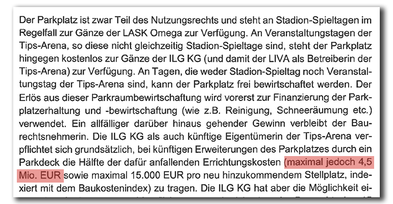 Der derzeitige Parkplatz mit 621 Stellplätzen ist Teil des Nutzungsrechts und steht an Stadion-Spieltagen zur Gänze der LASK Omega zur Verfügung. An Veranstaltungstagen der Tips Arena ist der Parkplatz hingegen zur Gänze von der ILG nutzbar. An spielfreien Tagen darf die Parkfläche von der LASK Omega bewirtschaftet werden, sie muss aber die Kosten für Erhaltung, Reinigung und etwaige Schneeräumung übernehmen. Allerdings hat die Stadt Linz einen dicken Brocken zu schlucken: Sie muss sich mit max. 4,5 Millionen Euro an der allfälligen Errichtung eines Parkdecks mit 1.000 Stellplätzen beteiligen.