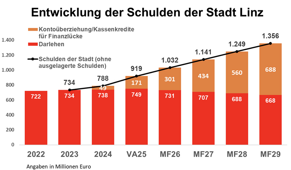 Jetzt wird’s eng für Linz: Offiziell hat die Stadt Ende 2024 insgesamt 738,5 Millionen Euro Schulden (ohne offene Kassenkredite) angehäuft. Bereits bis 2029 sollen sich diese laut Prognosen auf 1,4 Milliarden Euro nahezu verdoppeln. Die steuerreiche Stadt Linz konnte 2024 nicht einmal die laufende Gebarung (minus von 21,5 Millionen Euro) ausgleichen, was vor allem an der enorm angewachsenen Zinsbelastung von 25,4 Millionen Euro liegt. Richtig Sparen will man dennoch nicht…