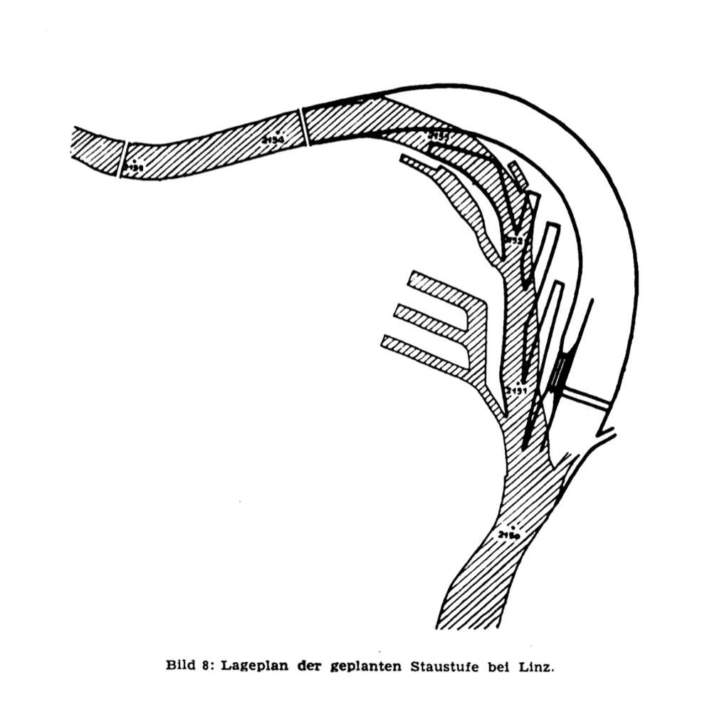 Gemäß der Pläne wäre Linz in den Staubereich der damals geplanten Kraftstufe Mauthausen gefallen. Stromaufwärts war die Stufe Ottensheim geplant. Laut Entwurf sollten die 13 Meter Gefälle zwischen diesen beiden Stufen unterteilt werden – durch eine eine Staustufe Linz. Diese hätte enorme Grabungsarbeiten und Einschnitte in die Natur verursacht.