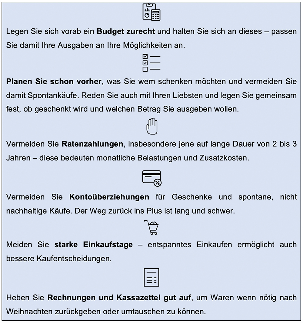 „Besonders wichtig: Keine Geschenke auf Pump! Ratenzahlungen sehen verlockend aus, letztlich kommt Shoppen auf Teilzahlung aber sehr teuer. Die Raten belasten nach Weihnachten noch monatelang das Budget – und in 12 Monaten ist schon wieder Weihnachten“