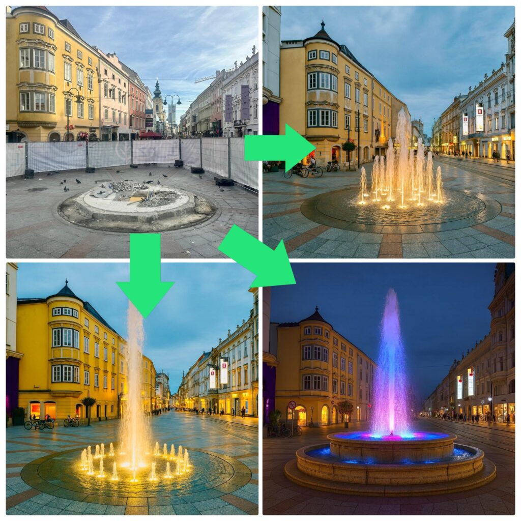Stattdessen sollen um 80.000 Euro ein Baum und eine Sitzbank als „kurzfristige Übergangslösung“ errichtet werden – irgendwie passt das nicht zusammen. Ganz abgesehen davon kühlt ein großer Brunnen mit Wassernebel die Umgebung weit mehr als ein Baum, der aufgrund der Platzverhältnisse sowieso nicht größer werden kann als 4 oder 5 Meter.