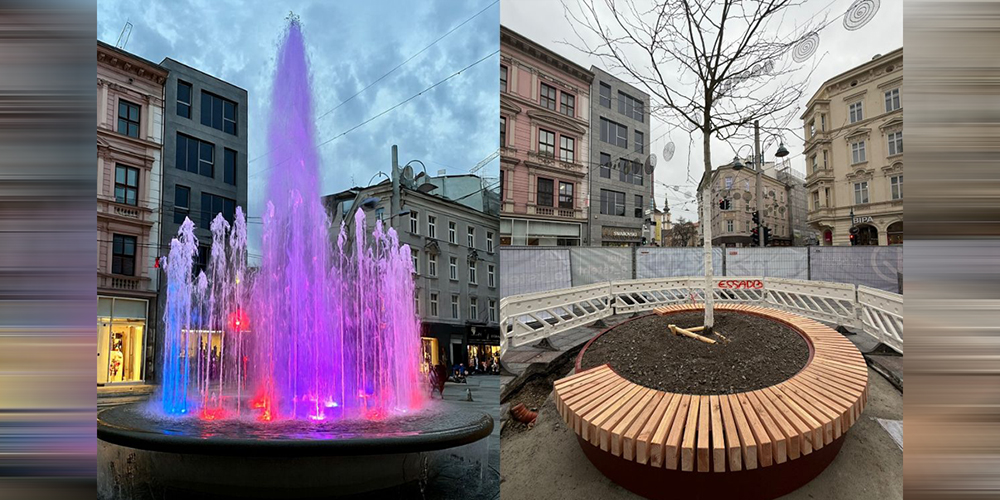 Das 79.000 Euro-Taubenmarkt-Bäumchen ist da. Auch wenn Klimastadträtin Eva Schobesberger den Mini-Baum bejubelt: Ein neuer Brunnen (wie auf unserem KI-Foto links) hätte den Platz nicht nur um ein Vielfaches besser gekühlt, er hätte auch den Charakter des Taubenmarktes als Treffpunkt weit besser unterstrichen.