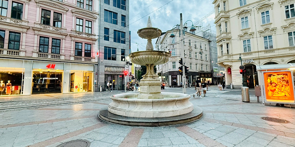Das Problem des Taubenmarkt-Areals war und ist aber nicht der Brunnen, sondern das Gesamt-Ensemble mit riesigen Mülleimern einer angrenzenden Fastfood-Kette, Stromkästen, versifften Radständern mit mehreren Radleichen, zwei unansehnliche Würstelbüden, abstoßende Metallgitter-Sitzbänke und ein Bus-Wartehäuschen, das ohne Rücksicht auf das Umfeld fast mitten auf den Platz gestellt wurde.