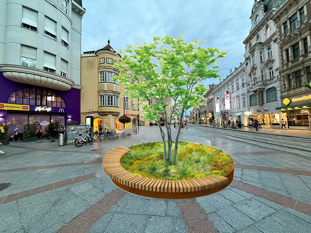 Zur Vorgeschichte: Der Sparkassenbrunnen am Taubenmarkt soll mit Ende 2025 abgebaut und an seinem ursprünglichen Standort in der Sparkassenzentrale an der Promenade wiedererrichtet werden. Als Ersatz hat die Stadt Linz eine begrünte Pflanzinsel mit einem Baum vorgesehen, eingefasst von einer Sitzbank in Form eines Dreiviertelkreises. In der offenen Rundung wird ein öffentlicher Trinkbrunnen installiert.