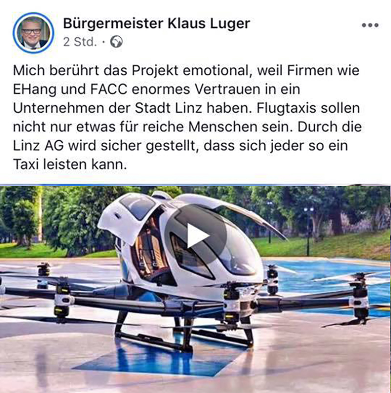 Für unfreiwilliges Amüsement sorgt ein „emotional berührter“ Bürgermeister Klaus Luger damals mit einem Posting, das eine Art „Volksdrohne“ für alle versprach. Demnach würde sich künftig jeder Linzer eine Flugdrohne als Transportsmittel leisten können, weil es „die LINZ AG sicherstellt.“ Fünf Jahre später gibt es jedoch noch nicht mal den für 2020 angekündigten Testbetrieb.