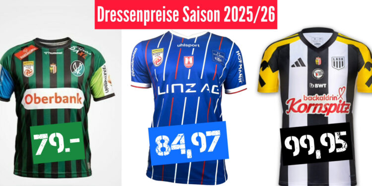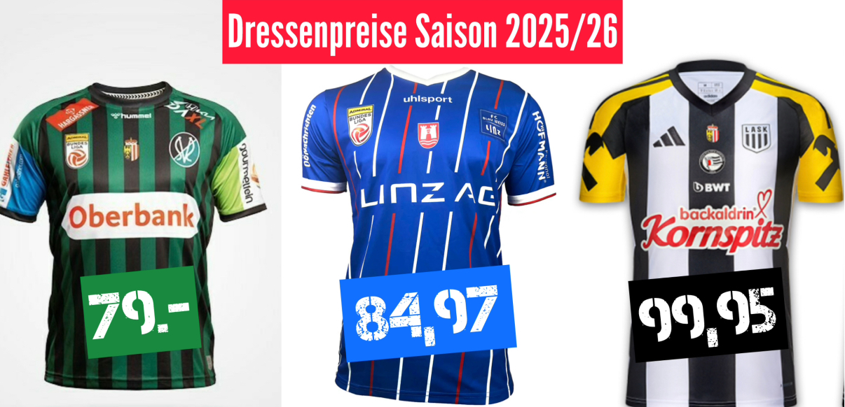 In den online Fanshop sind die Original-Dressen der drei oberösterreichischen Bundesligisten bereits erhältlich. Am günstigsten kommen heuer die Fans des SV Ried davon (79.- Euro), die blau-weißen Supporter aus Linz müssen 84,97 Euro abdrücken. Teuer wird es für die Fans vom LASK mit 99,95 Euro – und damit um fünf Euro mehr als etwa bei Rapid Wien.