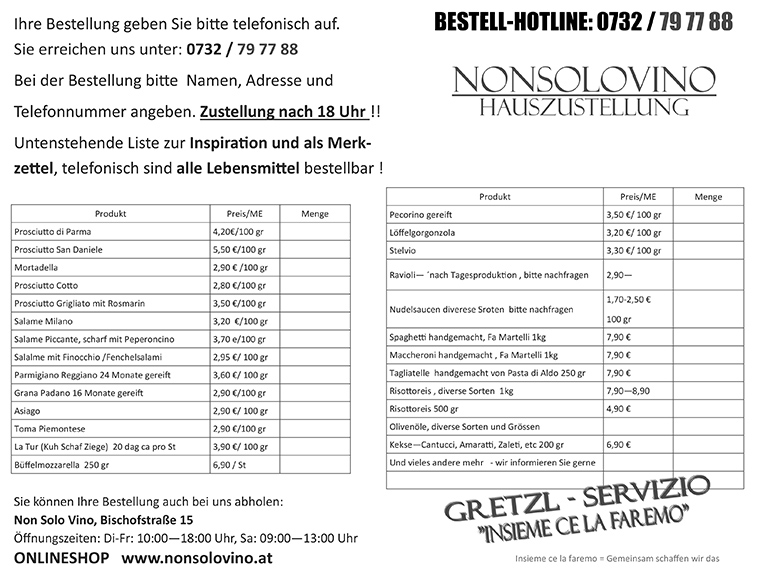 Wir freuen uns, mit „NONSOLOVINO“ ein weiteres kleines Linzer Unternehmen unterstützen zu können: „Als Lebensmittel- und Spezialitätengeschäft mit Italien-Schwerpunkt kämpfen wir mit einem ziemlichen Umsatzeinbruch. Wir haben uns eine zusätzliche Alternative überlegt, um den Rückgang aufzufangen: Take away!“, so Birgit Massimilla-Kern von NONSOLOVINO.