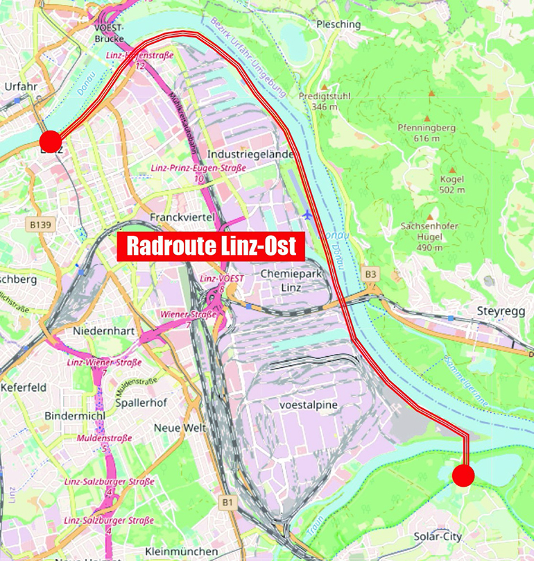 Knappe zehn Kilometer wäre die neue Route an der Donau lang, damit wäre man von der Solar City in etwa 30 Minuten am Hauptplatz oder auf der Kepler Universität. Mit dem E-Bike ist die Route sogar in 20 Minuten zu schaffen. Zum Vergleich: Die Straßenbahn benötigt für die Strecke zum Hauptplatz 36 Minuten und bis zur Universität gar 52 Minuten.