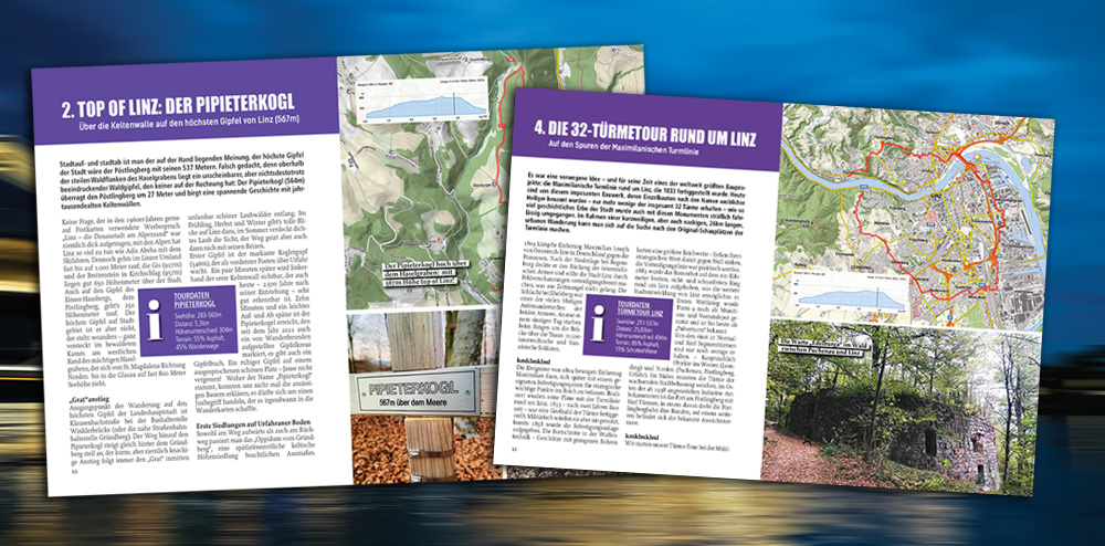 Herausgekommen ist genau das, was Linz ausmacht: Gipfel, Wälder, Hochhäuser, Wasser, Hafen… ein Mix aus Natur, Stadt, Industrie, Historie, urbanen Plätzen, unbekannte Sehenswürdigkeiten, Magic und Lost Places, die darauf warten, entdeckt zu werden. Für Urbanisten, Neugierige, Besucher und für alle „Dasigen“, die ihre Stadt neu, mit anderen Augen und hikend entdecken wollen.