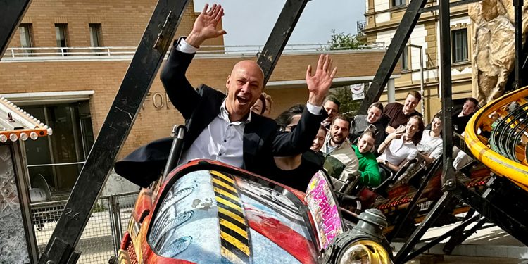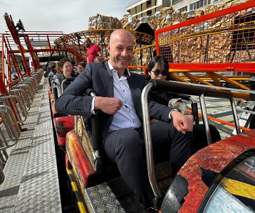 Noch genau zehn Tage bis zum Urfahraner Frühjahrsmarkt – und die Feuer & Eis Achterbahn als große neue Attraktion steht bereits. Im Rahmen der heutigen Pressekonferenz drehte auch Vize-Bürgermeister Martin Hajart eine erste Runde. Die 320m lange Bahn feiert ihre Österreich-Premiere und soll zum Stammgast am Jahrmarkt werden.