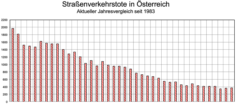 Die schwärzesten Jahre der Verkehrssicherheit gab es 1972 mit einem österreichweiten Spitzenwert von 2.948 Getöteten – das sind über acht pro Tag. Seither konnte die Zahl auf 369 im Jahr 2022 gesenkt werden – das ist ein Minus von 88 Prozent (Quelle: Statistik Austria). Dabei hat sich die Zahl der zugelassenen Fahrzeuge seit 1972 von 2,5 Millionen auf 7,3 Millionen im Jahr 2022 nahezu verdreifacht. Noch vor zehn Jahren mussten mit 531 Getöteten deutlich mehr als 500 Verkehrstote beklagt werden.