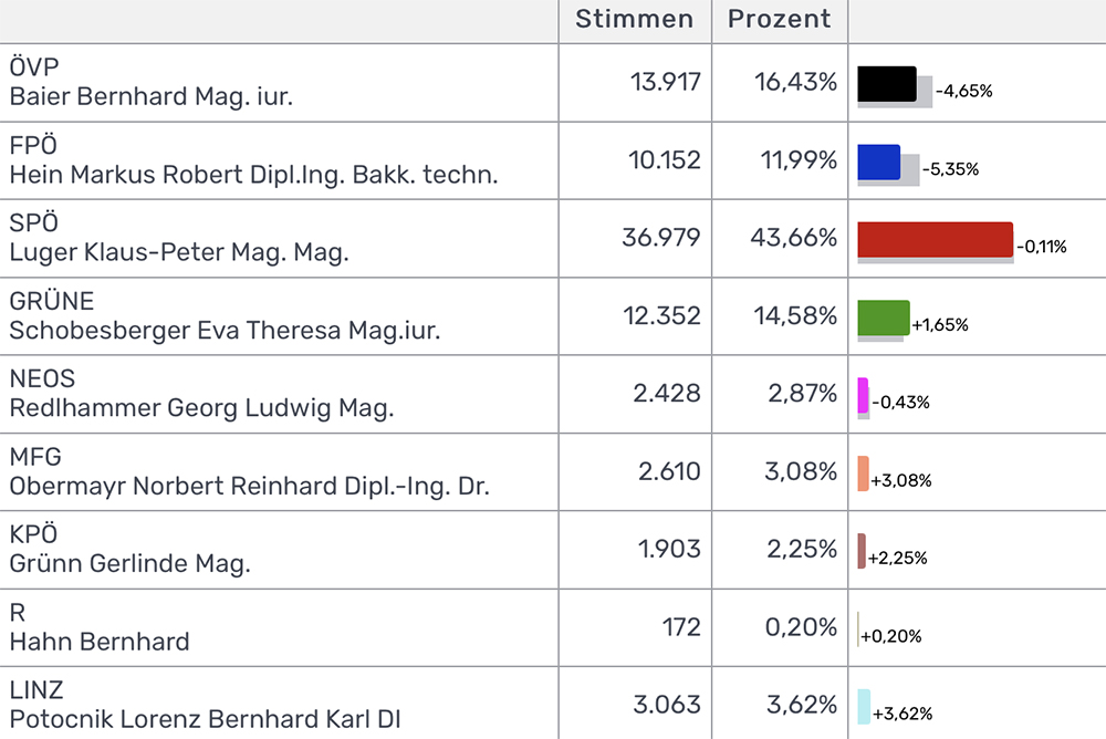 Bei der Direktwahl zum Linzer Bürgermeister ergab sich ebenfalls ein eindeutiges Bild: Auch hier hat Klaus Luger klar die Nase vorne, fast 44 Prozent wählten ihn im ersten Wahlgang. Da er jedoch nicht die 50-Prozent-Hürde nicht übersprang, wird in zwei Wochen eine Stichwahl gegen Bernhard Baier nötig, der mit mageren 16,43 Prozent auf Rang 2 kam.