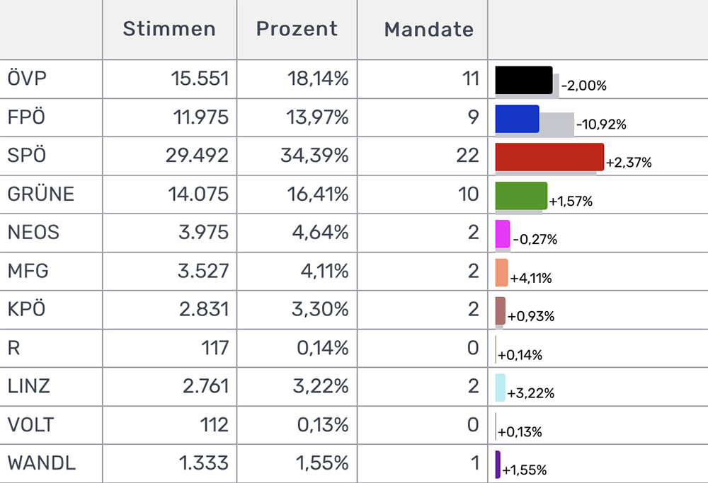 Aufgrund der niedrigen Wahlbeteiligung gelang der Bürgermeisterpartei SPÖ das Kunststück, mit fast 3.000 Stimmen weniger als 2015 ein Plus von 2,4 Prozent zu holen. Am eindeutigen Ergebnis gibt es nichts zu rütteln: Mit 34,4 Prozent holte die SPÖ fast doppelt so viele Stimmen wie die ÖVP, die trotz Verlusten die neue Nummer 2 ist.