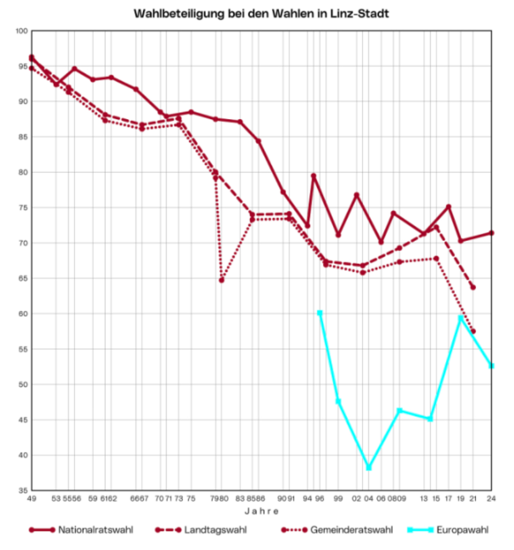 Der Effekt ist auch auf regionaler Ebene zu spüren, wie der langjährige Vergleich in Linz zeigt.