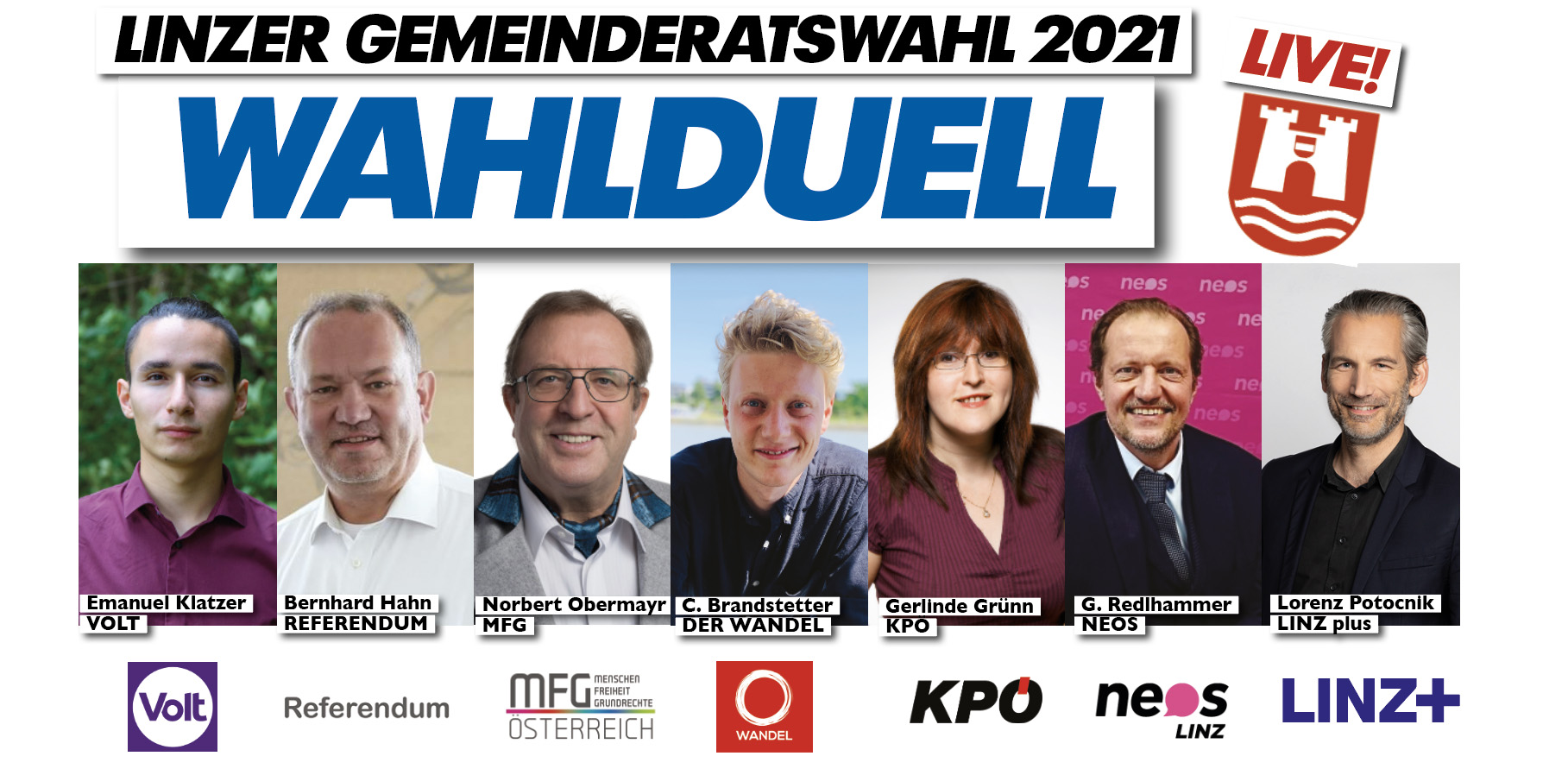 Wer: Gerlinde Grünn (KPÖ), Georg Redlhammer (NEOS), Lorenz Potocnik (LINZplus),Bernhard Hahn (Referendum), Norbert Obermayr (MFG), Clemens Brandstetter (Wandel) und Emanuel Klatzer (Volt).