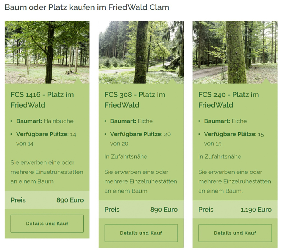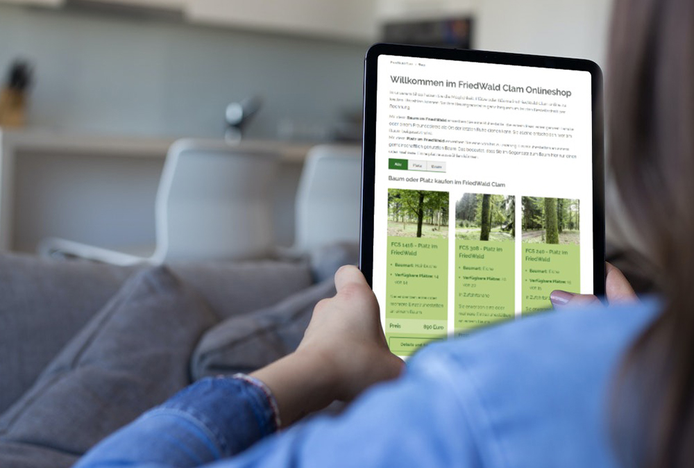 Der FriedWald-Onlineshop bietet eine Übersicht über die Bäume, an denen Gräber online erworben werden können. Interessierte können den FriedWald zunächst über Panoramatouren erkunden. Die Panoramen geben das Gefühl, im Wald zu stehen. Der virtuelle Spaziergang vermittelt einen Eindruck vom Wald mit seinen Schönheiten und Besonderheiten als Ort der letzten Ruhe: vom Parkplatz über die Waldwege bis hin zum Andachtsplatz.