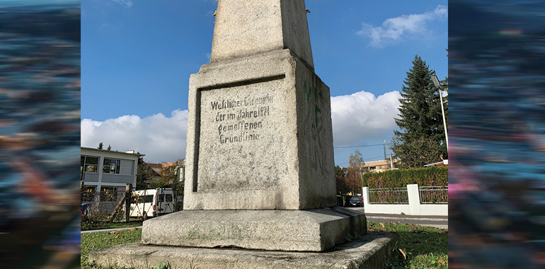 Wobei der Begriff „Weltmittelpunkt“ in diesem Fall nicht wissenschaftlichen Ursprungs ist. Der Volksmund bediente sich dieses Wortes, als vor über 150 Jahren zwei opulente Steinsäulen ins damalige Nirgendwo im Raum Neue Heimat und Kleinmünchen gesetzt wurden. Bei den beiden wuchtigen Steinen handelt es sich um exakt vermessene Endpunkte einer Grundlinie, die 1871 bzw. 1881 eingerichtet wurde und in west-östlicher Richtung durch den Linzer Süden verläuft.