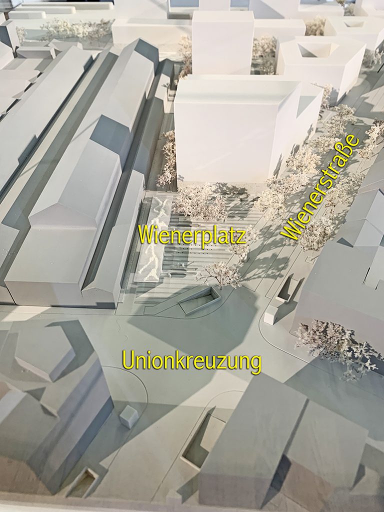Spannend sehen sie aus, die ersten Renderings zur Neugestaltung des Bahnhofsviertels zwischen Hauptbahnhof, Unionstraße und Wienerstraße. Als Zentrum soll direkt bei der Unionkreuzung der 2.000 m² große WIENER PLATZ entstehen – mit viel Steinfläche und einer brunnenartigen Wasseranlage samt Fontänen, aber leider wenig Grün. 2023 soll mit der Bebauung des gesamten, fast 16.000 m² großen Areals begonnen werden.